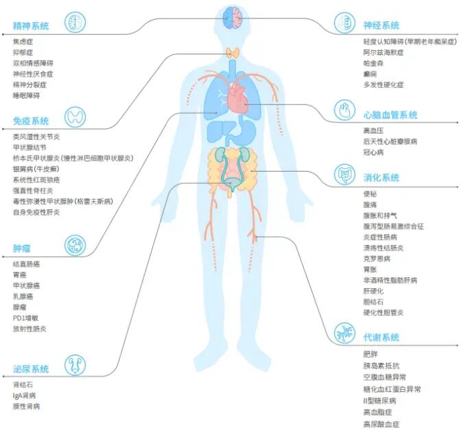 首创揭示 51种疾病与高达800+种关键肠道微生物的明确正负相关性(即促进或抑制疾病发生的具体菌种),构建全球领先的“菌-病关系”图谱,为精准干预提供清晰靶点。