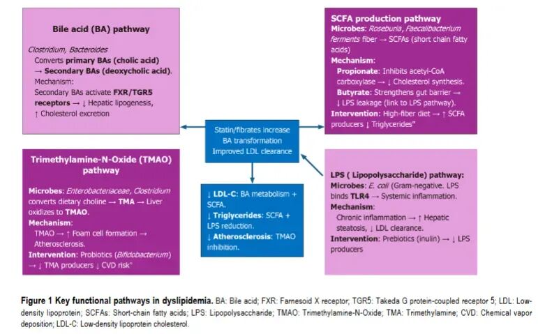此外,菌群本身产生的代谢物,如短链脂肪酸和氧化三甲胺,也直接调节着血脂平衡。理解这些相互作用,未来有望实现个性化降脂治疗:通过检测个体的微生物标志物(如产氧化三甲胺潜力、阿克曼氏菌丰度),结合宿主基因(如载脂蛋白E基因型)和临床数据,来预测药物反应、指导用药选择与剂量。